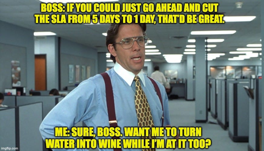 Eventually, I wrote a process that brought the SLA down to 3 days. Over the coming months, we chipped away at the problem and finally hit the 1-day mark. The "Next Best Thing" got us there step by step.
