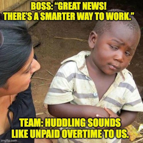 I once worked with a back-office team that started daily huddles. Initially, they hated it. Why? Because we didn’t remove the hour-long weekly call that covered the same information. The minute we cut that meeting, they loved the huddles, and engagement went up.